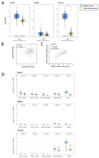 We investigated the expression of TRPM7, TRPM6 and periostin (POSTN), a marker of activated CSPs [13,44], in pancreatic cancer samples using GEPIA tool. We observed that POSTN mRNA relative level was increased in tumor samples when compared with a normal pancreas (p < 0.05, Figure 7A). We also observed a trend toward an increase in TRPM7 that was not statistically significant. TRPM6 expression was not altered in PDAC. Spearman correlation analysis showed that TRPM7 and POSTN were positively correlated in tumor samples (r = 0.24; p = 0.0013, Figure 7B). We also observed similar findings in an independent PDAC dataset (GSE28735), in which POSTN mRNA level was increased in tumor sample compared to adjacent non tumoral tissue (not shown). Moreover, we showed a correlation between POSTN and TRPM7 (r = 0.4041; p= 0.0059, Figure 7C). As these samples were originated from surgical resection, the intrinsic intra-tumoral heterogeneity also led to high level of stromal cells, including cancer-associated fibroblasts. We investigated the expression of TRPM7, TRPM6 and POSTN in pancreatic cancer samples (PAAD-TCGA) and normal pancreas samples from GTEX using GEPIA2021, which enables to filter the cell types of interest in normal tissue from GTEX or cancer types from TCGA [36]. The expression was analyzed in CD4+, CD8+, endothelial cells, macrophages and cancer associated fibroblasts (CAFs) using EPIC deconvolution tool [35]. PAAD samples are enriched with CAFs, endothelial and immune cells (not shown). We observed that TRPM7 and POSTN expression is significantly enriched in CAFs (p < 10−15) and to a lower extent in endothelial cells from PAAD tumor samples compared with a normal pancreas from GTEX (Figure 7D). TRPM6 was not detected in any cell type analyzed.