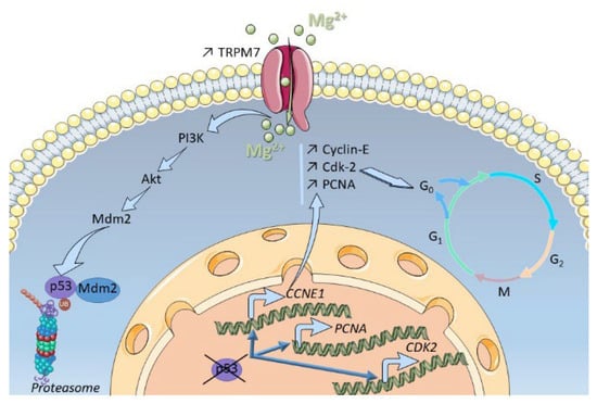 To summarize, our data indicated that: (i) the TRPM7 channel was able to regulate cation entry and magnesium homeostasis in activated human PSCs; (ii) the expression level of the TRPM7 channel varies according to the level of activation of the PSCs, a strong expression of TRPM7 being correlated with a high activation level; (iii) the TRPM7 channel was involved in the proliferation of activated human PSCs, by allowing the G1-S transition (mediated notably by CDK2 and PCNA) via the activation of the PI3K/AKT pathway; (iiii) this latter pathway was able to inhibit the p53 transcription factor in a magnesium-dependent manner. Taken together, our results strongly suggest that TRPM7 was involved in PSC activation, leading to enhanced proliferation.