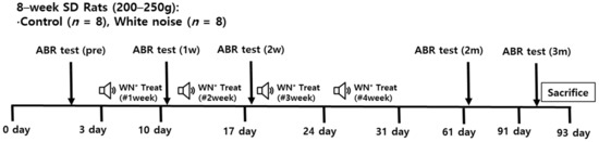 The noise was periodically exposed for 4 weeks in the noise-exposed rats (Figure 1). The hearing levels were measured at 1 week, 2 weeks, 2 months, and 3 months after the noise exposure.