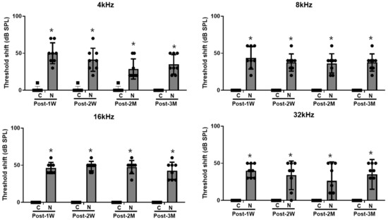 Hearing threshold shifts after noise exposure (n = 8 per group). The noise exposed rats demonstrated hearing threshold shifts at 1 week, 2 weeks, 2 months, and 3 months post noise exposure at 4, 8, 16, and 32 kHz. (* p < 0.05; unpaired t-test between the control and noise-exposed groups; C: control rats; N: noise rats).