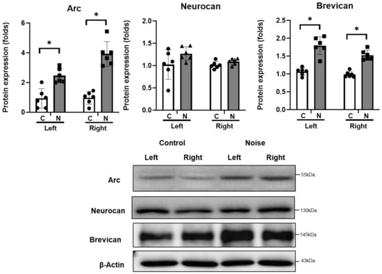 The protein expression levels of arc were higher in the CN of noise-exposed rats than in those of the control rats (0.95 [SD = 0.53] vs. 3.19 [SD = 1.00], p < 0.001) (Figure 3). Brevican was also expressed at higher levels in the CN of noise-exposed rats than in those of the control rats (1.02 [SD = 0.10] vs. 1.66 [SD = 0.24], p < 0.001) (Figure 3).