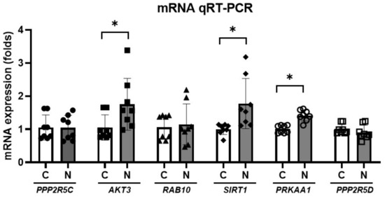 mRNA expression levels of PPP2R5C, AKT3, RAB10, SIRT1, PRKAA1, and PPP2R5D were higher in the noise-exposed rats than in the control rats (n = 8 per group; * p < 0.05; unpaired t-test between control and noise-exposed rats).