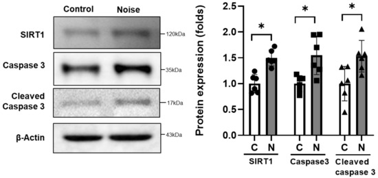 SIRT1, caspase 3, and cleaved caspase 3 expression in the cochlear nuclei after noise exposure (n = 6 per group). SIRT1, caspase 3, and cleaved caspase 3 expressions were higher in the noise-exposed group (* p < 0.05; unpaired t-test between control and noise-exposed rats; C: control rats; N: noise rats).