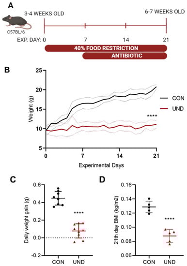 C57BL/6 mice aged 3–4 weeks were randomly assigned to the CON or UND groups (Day –3). The mice from the CON group were offered food ad libitum. The undernourishment protocol consisted of a reduction of 40% of the daily food consumption for three weeks (from experimental day 0 to day 21) [] (Figure 1A).