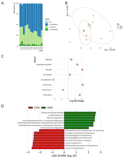 Metabolic pathways were accessed using PICRUSt2 to determine whether the observed taxonomic differences between groups played a role in their functions. LEfSe analysis compared metabolic changes in the gut microbiota in each group (Figure 2D). All displayed pathways presented an LDA score > 2.0. The UND group changes were mainly related to cellular growth. Pathways related to the biosynthesis of sugar nucleotides [O-antigen building blocks biosynthesis (0.066 ± 0.004 vs. 0.073 ± 0.005; p < 0.001; p FDR < 0.001), UDP-N-acetyl-D-glucosamine biosynthesis I (0.052 ± 0.006 vs. 0.062 ± 0.007; p < 0.001; p FDR < 0.001)], amino acids [L-lysine biosynthesis I (0.074 ± 0.006 vs. 0.083 ± 0.006; p < 0.001; p FDR < 0.001), L-arginine biosynthesis II (0.081 ± 0.009 vs. 0.092 ± 0.006; p < 0.001; p FDR < 0.001)], cell membrane lipids [phosphatidylglycerol biosynthesis I (0.0921 ± 0.003 vs. 0.099 ± 0.006; p < 0.001; p FDR < 0.001), and phosphatidylglycerol biosynthesis II (0.0921 ± 0.003 vs. 0.099 ± 0.006; p < 0.001; p FDR < 0.001)] were less present compared to the CON group. Moreover, with the compromising of growth-related metabolic pathways, UND presented increases in cell component degradation pathways, such as carbohydrates [pentose phosphate pathway (0.073 ± 0.008 vs. 0.062 ± 0.005; p < 0.001; p FDR < 0.001)], polysaccharides [mannan degradation (0.047 ± 0.007 vs. 0.038 ± 0.005; p < 0.001; p FDR < 0.001)], purine nucleotides [urate biosynthesis/inosine 5’-phosphate degradation (0.112 ± 0.005 vs. 0.101 ± 0.008; p < 0.001; p FDR < 0.001)], and cellular wall [chitin derivatives degradation (0.00011 ± 0.00022 vs. 0 ± 0; p < 0.001; p FDR < 0.001)]. There was also an increase in the vitamin biosynthesis-related pathways of preQ0 (0.067 ± 0.007 vs. 0.05 ± 0.006; p < 0.001; p FDR < 0.001), 6-hydroxymethyl-dihydropterin diphosphate III (0.097 ± 0.005 vs. 0.088 ± 0.007; p < 0.001; p FDR < 0.001), and 6-hydroxymethyl-dihydropterin diphosphate I (0.096 ± 0.005 vs. 0.087 ± 0.007; p < 0.001; p FDR < 0.001).