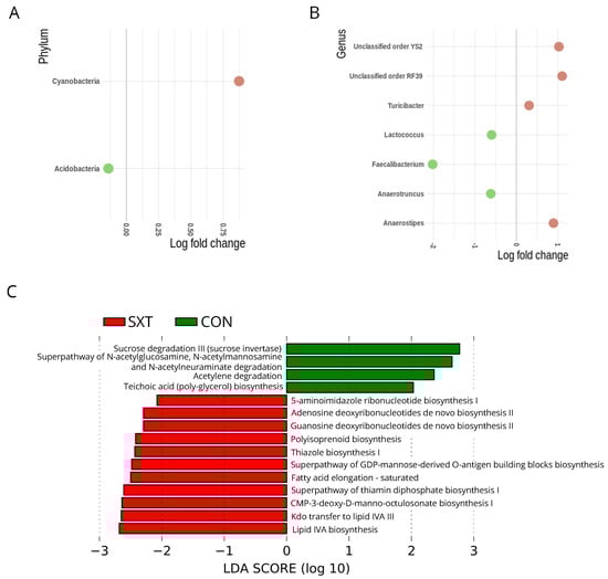 ANCOM-BC analysis was used to compare the gut microbiota taxa that were significantly different between the CON and SXT groups (Figure 4A,B). We identified differences at a phylum level; SXT mice presented an increase in Cyanobacteria and a decrease in Acidobacteria (FDR < 0.05) (Figure 4A). We also observed differences at a genus level; SXT mice had an increase in Anaerostipes, Turicibacter and unclassified genera from order YS2 and order RF39 (FDR < 0.05) (Figure 4B). In addition to that, SXT mice showed a decrease in Lactococcus, Faecalibacterium, and Anaerotruncus genera (FDR < 0.05) (Figure 4B).