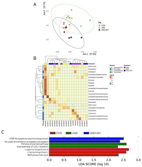 A heatmap representation of the ANCOM-BC analysis showed that UND had a significant increase in most of the microbiome composition when compared to the CON and UND + SXT mice (Figure 5B) (Supplemental Table S1). We observed an increase in Haemophilus, unclassified Clostridiales, Klebsiella, unclassified Enterobacteriaceae, Sutterella, unclassified Desulfovibrionaceae, Adlercreutzia, and unclassified Clostridiaceae. Whereas UND+SXT presented significant increase of Anaerotruncus genus and the decrease of Sutterella, Parabacteroides, Lactococcus, Haemophilus, Candidatus Arthromitus, Streptococcus, Veillonella, Odoribacter, Anaerostipes, Adlercreutzia and Clostridium genus (Supplemental Table S1).
