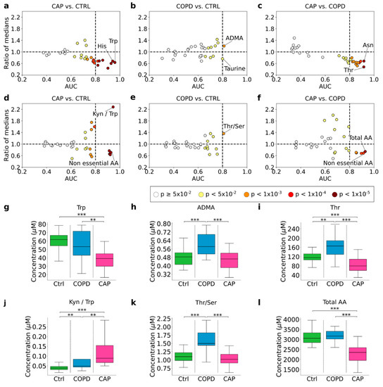 - Inoue, S.; Ikeda, H. Differences in plasma amino acid levels in patients with and without bacterial infection during the early stage of acute exacerbation of COPD. Int. J. Chron. Obstruct. Pulmon. Dis. 2019, 14, 575–583. [Google Scholar] [CrossRef] [PubMed] [Green Version]