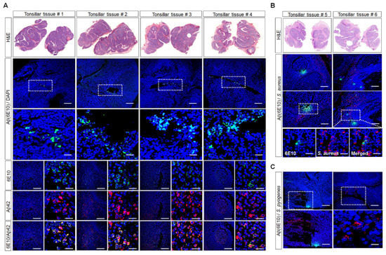 Microscopic images of human palatine-tonsil specimens subjected to immunohistostaining. (A) H&E images after the staining of the paraffin-embedded sections or confocal-microscopy images after the staining of the paraffin-embedded sections with the 6E10 antibody (green) or Aβ42 antibody (red) to detect Aβ deposition. The boxed area indicates the 6E10- or Aβ42-positive cells in the human palatine-tonsil specimens (tissue #1, 7 years old; tissue #2, 49 years old; tissue #3, 52 years old; tissue #4, 53 years old). Nuclei were labeled with DAPI (blue). Scale bars: 200 μm, 100 μm, 20 μm. (B) H&E images after the staining of the paraffin-embedded sections or confocal-microscopy images after the staining of the sections with the 6E10antibody l (green) or S. aureus antibody (red). The boxed area indicates the 6E10- or S. aureus-positive cells in the human palatine-tonsil specimens (tissue #5, 59 years old; tissue #6, 50 years old). Nuclei were labeled with DAPI (blue). Scale bars: 200 μm, 100 μm, 10 μm. (C) Confocal-microscopy images after the staining of the sections with the 6 × 1010 antibody (green) or S. pyogenes antibody (red). The boxed area indicates the 6E10- or S. aureus-positive cells in the human palatine-tonsil specimen. Nuclei were labeled with DAPI (blue). Scale bars: 200 μm, 100 μm, 10 μm. All images are representative of two or three independent experiments.