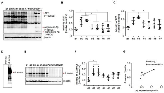 Many studies questioned the association between amyloid deposition and neuropathology in AD and investigated the potential role of pathogens [,,,]. Aβ peptides are involved in the innate immune response and protect animals from fungal and bacterial infections []. Recently, amyloidogenic peptide Aβ1–42 was shown to bind to the surface of S. aureus in vitro []. Immunocytochemistry, scanning electron microscopy, and Gram-staining analyses revealed the accelerated aggregation of Aβ1–42 when it was incubated with S. aureus [], indicating that Aβ1–42 agglutination was accelerated in the presence of microorganisms. Moreover, the finding that Aβ had antimicrobial activity indicated that microbial infections induced the formation of Aβ-containing senile plaques []. Notably, in our samples of human tonsillar tissue, we found that there was a robust correlation between the levels of Aβ fragments (~15 kDa) and S. aureus in seven different tonsils (Figure 3).