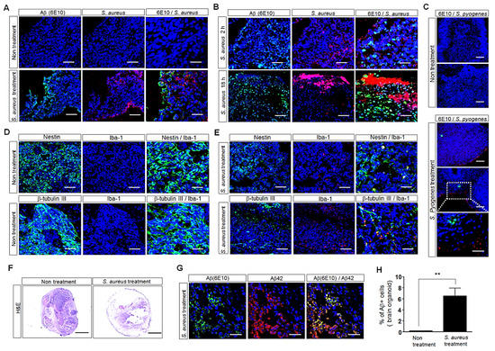 To further validate the effect of S. aureus on Aβ levels, we generated cerebral organoids by culturing hiPSCs (Figure 5F) and then added S. aureus to the organoid cultures. After treatment with S. aureus, the morphology of the human brain organoids was observed with H&E staining. Staining showed that S. aureus treatment induced cell death in the brain organoids compared with the brain organoids cultured in the absence of S. aureus (Figure 5F). The immunofluorescence analyses of 6E10showed that the Aβ-protein level was greater in the brain organoids cultured for 2 h in the presence of S. aureus than in the brain organoids cultured in the absence of S. aureus (Figure 5A). Moreover, the Aβ-protein level was greater in the brain organoids cultured for 18 h in the presence of S. aureus than in the brain organoids cultured for 2 h in the presence of S. aureus (Figure 5B). Treatment with S. aureus resulted in approximately 40-fold more Aβ-positive cells in the treated brain organoids than in the untreated organoids (Figure 5H). However, the Aβ-protein level was slightly increased in the brain organoids cultured in the presence of S. pyogenes compared with the brain organoids cultured in the presence of S. aureus (Figure 5C). The immunostaining of the organoid sections with both anti-6E10and anti-Aβ42 antibodies showed that many cells were double positive for 6E10and Aβ42 (Figure 5G). The immunofluorescence analyses showed that treatment with S. aureus reduced the expression of neuronal cells but increased the expression of inflammatory microglial cells in the brain organoids compared with the brain organoids cultured in the absence of S. aureus (Figure 5D,E). These results showed that Aβ expression increased in the culture of human tonsil organoids with S. aureus, as shown in Figure 4. Taken together, these results suggest that the interaction between Aβ protein and S. aureus may increase Aβ-peptide production, which can lead to Aβ-related AD.