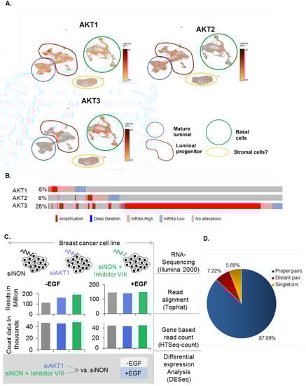 Single cell sequencing-based data analysis: AKT1, AKT2, and AKT3 expression data were extracted from single cell RNA-seq data of the healthy breast tissues using Loupe Browser (10X Genomics) as reported recently []. Markers used for cell type annotation are also described in the publication. The details of the samples and methods used to generate the referred single-cell sequencing atlas are described in Bhat-Nakshatri et al. [].