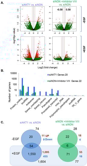 Differentially expressed genes were obtained for each experimental condition with respect to control and with and without EGF stimulation. To assess the effectiveness of the selective AKT1-siRNA used, we first determined the levels of AKT1 mRNA (and AKT2 and AKT3 mRNA as controls) in the processed datasets, in addition to initial examination of the AKT1 protein (Supplementary Figure S1A). As expected, use of AKT1-siRNA was accompanied by a reduced expression of AKT1 (not AKT3 as a negative control) (Supplementary Figure S1B). For obtaining an overall larger view of gene distribution among experimental conditions and for performing an initial assessment of AKT1 isoform specific changes in the transcriptome, the comparison of the differentially expressed genes was performed before applying the statistical threshold in Figure 2. This was followed by implementation of the quality control measures to select differentially expressed genes with at least a 1.5-fold change and a p-value less than 0.05 for further analysis. Statistically significant genes with p-value < 0.05 and >1.5-fold change were identified using a negative binomial test. A total of 3898 and 2908 genes were found to be differentially expressed, respectively, for AKT1 knockdown and cells treated with inhibitor VIII with at least a 2-fold change over the cells treated with the control siRNA (siNON). Comparative analysis of differentially expressed genes found sets of 2653 and 1663 genes to be uniquely regulated by siAKT1 and Inhibitor VIII (AKT-VIII), respectively, in unstimulated breast cancer cells (Figure 2A). Upon EGF stimulation, these affected gene numbers were changed to 5325 (siAKT1) and 2740 (AKT-VIII) differentially expressed genes. As the goal of the study was to determine the nature of AKT1-dependent modulation of transcriptome, we found a total of 4202 and 1619 genes were uniquely regulated by siAKT1 and inhibitor VIII, respectively (Figure 2C). The number of differentially expressed genes in each chromosome was analyzed to observe the choice of the preferred target gene genomic loci. We noticed that chromosomes 1 and 19 represent relatively higher fractions of altered genes in both unstimulated and EGF-stimulated breast cancer cells, whereas differentially expressed genes on chromosome 2 were observed only upon EGF stimulation (Figure 2C,D). In brief, we observed that AKT1 could regulate specific set of genes and thus could influence the nature of breast cancer transcriptome.