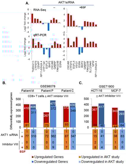 To further validate the noticed modulation of AKT1 status-dependent transcriptome in patient-derived biomaterial, we attempted to search for datasets from human cancer or other studies. We found two AKT-silencing based transcriptome datasets from the Gene Expression Omnibus (GEO). The first dataset reported mRNA expression profiles of CD8+ T cells, derived from an unrelated study involving three acute lymphocytic leukemia (ALL) patients—designated as patient M, P, and C, and ex vivo treated with a pan-AKT inhibitor VIII []. We observed an overlap of 816 (410 upregulated, 406 downregulated), 744 (267 upregulated, 477 downregulated), 802 (372 upregulated, 430 downregulated) genes between the results from MCF-7 cells and patients M, P, and C, respectively (Figure 5B). When we analyzed the status of upregulated and downregulated genes individually upon silencing AKT1, we observed a higher number of overlaps among the downregulated genes (Figure 5C, blue bars). Upon comparing the levels of overlapped genes between AKT1-silenced MCF-7 cells with the AKT inhibitor VIII-treated CD8+ T cells (Figure 5B, lower panel), we observed a substantial overlap between two differentially regulated gene sets, especially under conditions of EGF stimulation. For example, we noticed an overlap of 77 upregulated genes between EGF-stimulated MCF-7 cells with siAKT1 and 81 upregulated genes in cells from patient M. Similarly, there was an overlap of 310 downregulated genes between EGF-stimulated MCF-7 cells with siAKT1 and 311 downregulated genes in patient M-derived cells treated with pan-AKT inhibitor. Using the second dataset, we performed a comparative analysis of our results with previously reported differentially expressed genes in AKT inhibitor VIII-treated HCT116 colorectal cancer cells and MCF-7 breast cancer cells []. As illustrated in Figure 5C, cancer cell lines also exhibited a similar pattern in the levels of differentially expressed genes with that of patients (Figure 5C, blue bars).