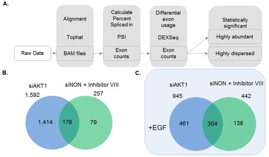 Identification of splice variants in AKT1-dependent transcriptome. (A) Tools and pipeline to identify the splice variants; and (B,C) comparative analysis of splice variants identified in each experimental conditions without (B) or with (C) EGF stimulation. Only the spliced genes showing at least 2-fold change with a p-value < 0.05 are considered from all the studies.