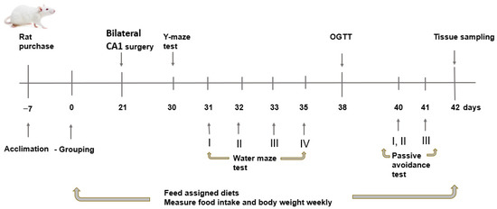 The rats were given the assigned diet for 20 days, and surgery to infuse Aβ(25–35) was performed on the 21st day. After being anesthetized with an intraperitoneal injection of ketamine and xylazine (100 and 10 mg/kg body weight, respectively; Bayer CropScience, Leverkusen, Germany), the rats were placed in a stereotaxic apparatus. A stainless-steel cannula was implanted in the bilateral CA1 subregions of the hippocampus according to the coordinates (lateral, −3.3 mm from the bregma; posterior, 2.0 mm from the midline; ventral, −2.5 mm from dura). The Aβ(25–35) peptide was reported to self-associate like the full Aβ(1–42) peptide by switching to insoluble β structures [28]. The Aβ(25–35) peptides eventually make fibrils much faster than the longer Aβ peptide [28], and its injection Aβ accumulation and neuronal morphological changes in the hippocampus [29]. It induces a neurotoxic effect through cholesterol-dependent membrane pore formation in the brain and neuroinflammation to exacerbate Alzheimer’s disease-like symptoms [30]. Aβ(25–35) for each rat was diluted to 0.005 mg in 300 µL with sterile distilled water, and it was filled in an osmotic pump (Alzet Osmotic Pump Company, Cupertino, CA, USA). The implanted canular was connected to the Aβ-filled osmotic pump (Alzet Osmotic Pump Company, Cupertino, CA, USA) to connect to the cannula implanted in the bilateral CA1 subregions. The Aβ(25–35) was infused continuously at 0.5 µL per hour for three weeks.