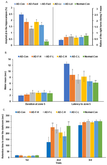 Approximately 2.4% Aβ deposition was detected in the hippocampus of the AD-con group. The AD-F-H, AD-C-H, and AD-C-L groups had lower Aβ deposition than the AD-Con group, whereas the AD-F-L group had the least deposition among the groups (Figure 2A). However, the Aβ deposition in the AD-F and AD-L groups was much higher than in the Normal-Con group, suggesting the fucoidan and carrageenan could not inhibit Aβ deposition entirely.