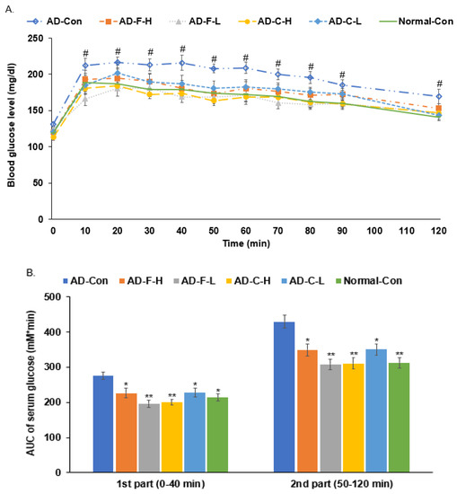 Fasting blood glucose concentrations were similar in all groups. After the glucose load, blood glucose concentrations increased in all groups. One-way repeated ANOVA exhibited a significant main effect of the treatments (p < 0.01), time (p < 0.01), and interaction between treatments and time (p < 0.01) on serum glucose concentrations during OGTT. Serum glucose concentrations were significantly higher in the AD-Con group at 10, 40, 50, 70, 80, and 120 min, and lowest in the AD-F-L group than in other groups at each time point by one-way ANOVA (p < 0.05). At 50 min, the blood glucose of the AD-C-H group also decreased compared to the AD-Con group. The blood glucose concentration of the AD-Con group increased from 0–40 min to peak, started to decline slowly from 50 min, continued to 120 min, still higher than that of the Normal-Con, AD-F-L, AD-C-L, and AD-C-H groups (p < 0.05) (Figure 3A). In addition, the blood glucose levels of the Normal-Con, AD-F-L, AD-F-H, AD-C-L, and AD-C-H groups all decreased after reaching a peak. The blood glucose levels in the AD-F-L group were consistently lower than those in the AD-F-H, AD-C-L, and AD-C-H groups (Figure 3A).