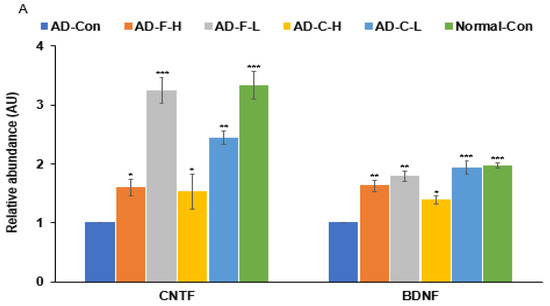 After treatment, the mRNA expressions of CNTF and BDNF in the brain tissue were much lower in the AD-Con group than in the Normal-Con group. The AD-F-H and AD-C-L groups showed similar CNTF mRNA expression to the AD-Con group, and AD-C-H showed similar BDNF mRNA expression to the AD-Con group. Compared to the AD-Con group, the AD-F-L group showed an increase in the mRNA expressions of CNTF and BDNF, similar to the Normal-Con group (p < 0.05). The AD-F-L and AD-C-L groups showed a similar increase in mRNA expression of BDNF to the Normal-Con group (p < 0.05) (Figure 4A).