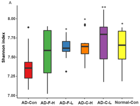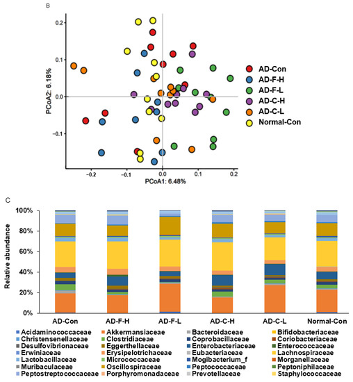 The α-diversity was lower in the AD-Con group than in the Normal-Con group, and its decrease was prevented in the AD-F-L and AD-C-H groups. AD-C-L increased the α-diversity compared to the Normal-Con group (Figure 5A). The β-diversity showed the separation between the AD-Con and Normal-Con groups, and AD-C and AD-F were separated from the AD-Con group (p < 0.05; Figure 5B).