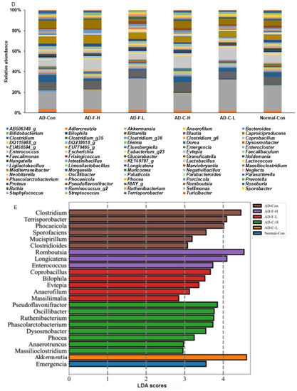 At the family level, the AD-F-L and AD-C-L groups increased Akkermencease, whereas the AD-F-L elevated Oscillospiraceae and decreased Peptostreptococcaceae compared to the other groups (Figure 5C). The AD-F-L and AD-C-L groups showed elevated Akkermentia and Escherichia at the genus levels. The AD-F-L group exhibited lower Romboutsia and Clostridium levels than the other groups (Figure 5D). The AD-Con group had higher Clostridium, Terrisporobacter, Phocaeicola, Sporofaciens, Mucispirillum, and Clostridiodes levels than the other groups, and the Normal-Con group had higher Emergencia levels (Figure 5E). The AD-F-H group contained Romboutsia, Longicatena, and Enterococcus, while the AD-F-L group showed an increase in Coprobacillus, Biophilia, Evtepia, Anaerofilum, and Massilimalia. The AD-C-H group showed an elevation of Pseudoflavonifractor, Oscillibacter, Ruthenibacterium, Phascolarctobacterium, Dysosmobacter, Phocea, Anerotruncus, and Massiloclostrodoum, and the AD-C-L group had a higher level of Akkermansia. The AD-Con group included high potential pathogenic bacteria compared to the other groups. AD-F-L and AD-C-L did not produce an increase in pathogenic bacteria, while AD-C-L elevated some beneficial ones.