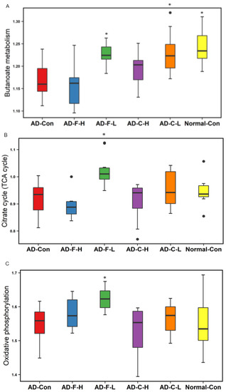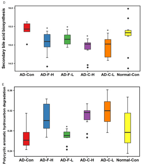 Metagenome function analysis of fecal bacteria by Picrust2 showed that fucoidan and λ-carrageenan intervention modified the SCFAs, energy, secondary bile acid metabolism, and toxic compound degradation. Consistent with the serum butyric acid concentrations, they were lower in the Normal-Con group than in the AD-Con group, and the AD-F-L and AD-C-L groups showed an increase as much as the Normal-Con. The citric acid cycle and oxidative phosphorylation related to the energy metabolism were similar in the AD-Con and Normal-Con groups and elevated in the AD-F-L group compared to the other groups (Figure 6B,C). The biosynthesis of secondary metabolites, mainly from bile acids, was similar in the AD-Con and Normal-Con groups, but AD-F and AD-C intervention decreased the metabolism (Figure 6D). Interestingly, the AD-F-H, AD-C-H, and AD-C-L interventions increased the degradation of toxic compounds related to improving metabolic disorders, such as polycyclic aromatic hydrocarbons (Figure 6E).