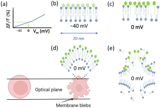 Some dyes allow for the measurement of cell membrane potential via the correlation with fluorescence intensity [14,15]. An example is the commercially available Fluovolt™ dye (FV), whose intensity rapidly responds (25%/100 mV) to changes in membrane potential (Figure 1a). The dye consists of three elements: the fluorophore (which is aligned with the outer layer of the membrane and has low internalization), the wire (which has low attenuation), and the donor (which has high voltage sensitivity). The voltage sensitivity of the donor is related to the local electric field, which affects the free energy for photoinduced electron transfer (PeT). PeT occurs from the donor through the wire to the fluorophore, and at lower membrane potentials (e.g., normal or resting membrane potential values) PeT is more favorable, while at higher membrane potentials it is less favorable. Therefore, a depolarization of the cell (for instance from −70 mV to 0 mV) should induce higher fluorescence emission, since PeT and fluorescence are competing processes [16]. With this in mind, a viable cell with a negative resting potential [12,17] (Figure 1b) that loses its membrane integrity should subsequently depolarize. Additionally, this depolarization should lead to an increase in dye intensity (Figure 1c). When the cell follows apoptotic cell death and forms apoptotic bodies, the surface area of the cell membrane [18] increases due to the formation of blebs, and so does the number of dye molecules contained in the optical plane, which should further increase the total dye intensity and account for increases in fluorescence above the increases due to depolarization (Figure 1d). When the cell membrane damage reaches the stage of membrane disintegration, the dye intensity decreases significantly, due to a loss of dye molecules (despite the fluorescence increase due to the depolarization of the cell) (Figure 1e).
