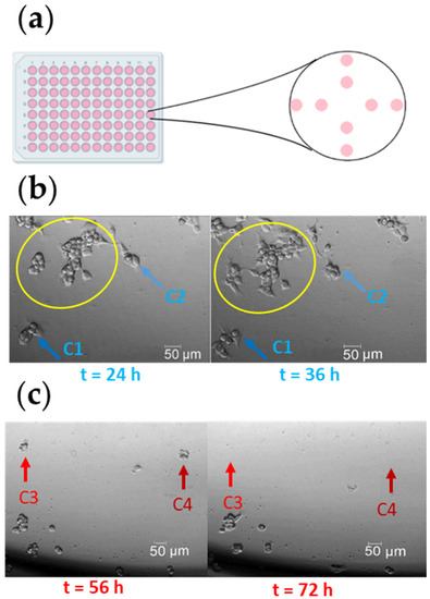 The experimental approach to classify viable or dead cells. (a) Schematic representation of cell seeding. (b) The clusters of cells marked with a yellow circle were excluded from the analysis. Cells marked with a blue arrow (dark blue arrow, C1; or light blue arrow, C2) were recorded at t = 24 h and t = 36 h for comparative analysis, to identify proliferating cells. These cells were classified as viable cells. (c) Cells marked with red arrows (light red arrow, C3; or dark red arrow, C4) were recorded at t = 56 h and t = 72 h for comparative analysis, to identify lysed cells. These cells were classified as dead cells.
