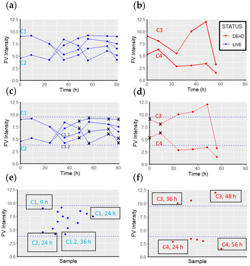 Correlation between FV fluorescence intensity, and cell viability or death. (a) FV intensity values measured in viable cells. (b) FV intensity values measured in dead cells. (c) Cell C1 replicated at t = 36 h, and its daughter cell, C1.1, at 80 h. The FV intensity values of the C1 cell for up to 36 h were recorded as viable FV intensity values. Similarly, all FV intensity values of the C1.1 cell up to 80 h were accounted for as viable FV intensities. The C1.2 cell did not replicate, so its FV intensity values were discarded (black crosses). Cell C2 replicated at t = 36 h. After this replication, none of the daughter cells replicated. Therefore, all FV intensity values up to 36 h are accounted for as viable FV intensity values, and the rest are discarded (black crosses). All viable FV intensities are considered to form the viable FV intensity range (within the dashed blue lines) (15 values in this example). (d) Both cells (C3 and C4) were lysed between the 56 and 72 h measurements. Therefore, the measurements at t = 0 h and t = 9 h are discarded (black crosses), as they are not within the 48 h span. (e) All viable intensities of FV recorded during the 80 h monitoring period constitute the “live cell sample” (15 values in the example). (f) All intensities of FV recorded during the 80 h monitoring period that are associated with dead cells constitute the “dead cell sample”.
