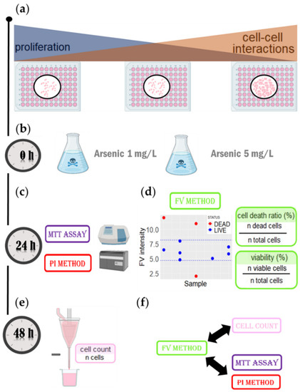Following the standard protocol for assessing cell viability [29], cells were seeded in 96-well plates with different cell concentrations to achieve different levels of confluency, namely 50% (CONF50), 75% (CONF75), and 100% (CONF100), respectively (Figure 4a). At a lower confluency, cell replication was abundant and there were fewer cell–cell interactions. When increasing the confluency, both parameters change inversely. When cells were attached (24 h after the seeding), they were treated with arsenic at two different concentrations (1 mg/L and 5 mg/L) for 24 h (Figure 4b). After treatment, cells viability was examined using four different cell viability assays: the MPCVA assay (Figure 4d), propidium iodide (PI) [30], the 3-(4,5-dimethylthiazol-2-yl)-2,5-diphenyltetrazolium bromide (MTT) assay [31] (Figure 4c), and cell counting using a flow cytometer [32]). (Figure 4e). The latter method had the lowest number of false-negative viability events because dead cells are determined as cells that are not counted (if the cell lyses, it is certainly dead). False-positive events should also have been limited, since a cell that has not lysed 48 h after treatment should be viable (at that point). Furthermore, a cell that has passed the point of no return in its cell death pathway (which is what the MPCVA measures) will most likely be lysed in the following 24 h.