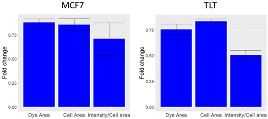 The effect of Triton x20 on MCF7 and TLT cells. (MCF7) The change in area covered by the dye (Dye area), area of the cell (Cell area), and compensated intensity (total FV intensity/Dye Area) of MCF7 cells treated with TritonTM X-100 with respect to untreated MCF7 cells. (TLT) The same procedure was applied to the TLT cell line.