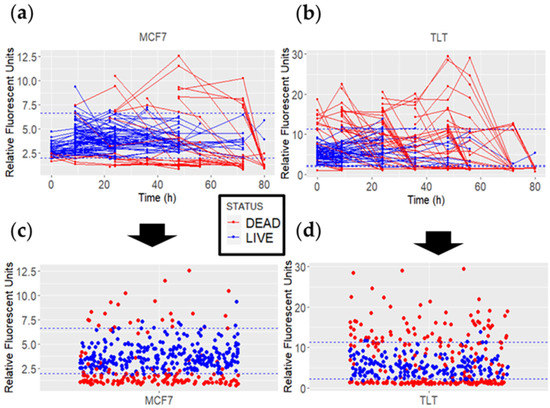 MCF7 and TLT FV fluorescence intensity values of dead (red) and viable (blue) cells over 80 h. The dashed blue line represents the viable FV intensity range. (a,b) The lines connect the FV intensity values of each cell over time. (c,d) All measured data points for each cell line are plotted as individual points.