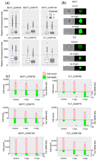 Nevertheless, cell death was underestimated in MCF7_CONF75 (4.7% CTRL, 4.3% As1, and 4.3% As5) because the cell numbers in the treated samples (6.5 × 103 cells and 4.6 × 103 cells in As 1 and As 5, respectively) were significantly lower than in the untreated samples (7.9 × 103 cells) (Figure 8c, MCF7_CONF75). When we statistically evaluate the results, we find significant differences (p-value = 2.2 × 10−16) between the duplicates of the untreated samples (Figure 8a, MCF7_CONF75). Extensive cell division may depolarize the cells of the second duplicate (at a much higher ratio than in the first duplicate), resulting in a significant difference in the FV intensity values between the duplicates of the untreated samples in MCF7_CONF75. Although such events are considered rare because the M2 phase of the cell cycle is rapidly completed [11] and the probability of measuring FV intensity at this time is low, it is still important to minimize the occurrence of false-positive events. These differences in FV intensity values, due to cell depolarization, have exceeded the limit of the “viable intensity range” and have led to an underestimation of cell death in the untreated samples. The MPCVA calculations in TLT cells showed an even better correlation and proportionality between the cell death rate and cell count than that observed in MCF7 (Figure 8c).