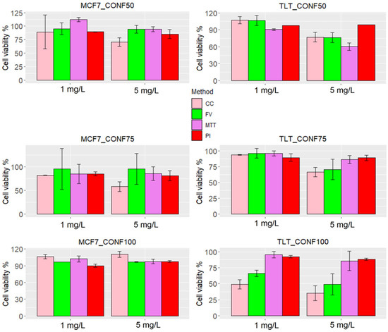Cell viability of each method in MCF7 and TLT cell lines. The measurement of the treated samples (1 mg/L and 5 mg/L arsenic) was compared with the measurement of the control group and presented as % viability. The viability of each group is shown with different colors: cell number is shown with a pink bar, MPCVA with a green bar, MTT with a purple bar, and PI with a red bar.