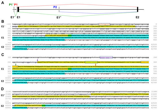 Transcripts PPP1R12A-201 and -202 start upstream of E1. This exon, which we denominate E1− (in order to preserve the exon nomenclature commonly used in the literature) is spliced into E1, leaving out a short (401 bp) intron and using the same translation start as transcripts PPP1R12A-203 and -208 (Figure 1C). A BLASTn search with E1− plus 20 bp of the E1 UTR showed three clones documenting the existence of an infrequently (<0.1%) used promoter upstream of P1 (Figure S2B,C) that we call P1−. Of note, the region comprising P1− and P1 overlaps with transcripts of the antisense gene PPP1R12A-AS1 that can be distinguished by their opposite orientation. The P1−–P1 region is GC-rich and harbors an accumulation of regulatory elements (Ensembl Genome Browser). Sp1 has been shown to bind to this GC-rich promoter region and two Sp1 binding sites were identified [21]. We scanned the region with the ALGGEN-PROMO website for Sp1 sites and identified a total of four sites with a percentage of dissimilarity below 5%, two in addition to the ones previously recognized by Machida et al. [21]. These sites are each placed approximately 40–60 bases upstream of one of the transcription start sites in the P1−–P1 region (Figure 1B,C).