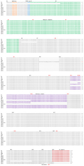 Multiple alignment of predicted human MYPT1 protein isoforms. The alignment was constructed using the Clustal Omega program of Uniprot. Exon boundaries are indicated on top of the alignment except for the LZ− variants, which are at the bottom. Phase 0 exons (between codons) are labelled in black, and phase 1 or 2 exons (after the first or second base of a codon) in red. Domains and motifs are shown in different colors.