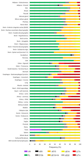 Regarding LZ− variants, usually both are present in the same organ. They are relatively abundant in organs rich in smooth muscle such as arteries, bladder, esophagus, stomach, intestine, uterus, and oviducts. Both variants combined range between 10 and 52% in frequency. They are less frequent in organs such as prostate, cardiac and skeletal muscle, adipose tissue, and breast and are absent from blood, spleen, brain, testis, liver, and pancreas.