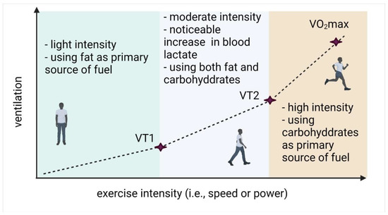 One approach to understand the points at which these metabolic switches occur, i.e., when an individual transitions from using fat as a primary fuel source to using carbohydrates, is through the lens of ventilatory thresholds VT1, VT2 and VO2max [11,12,13,14]. As exercise intensity increases, first ventilatory threshold (VT1) can be identified as a point when breathing rate starts to increase but it is still possible to carry on a conversation; at the second ventilatory threshold (VT2), the intensity is high enough that fatty acid oxidation is no longer sufficient to meet the demand for energy, resulting in upregulation of carbohydrate metabolism, both aerobic and then anaerobic. This results in increased levels of measurable blood lactate as it can no longer be contained in the muscle and is released into the blood [15]. Typical level of blood lactate associated with this transition is around 2 mmol/L; transition to exercise beyond this threshold can be observed as a point where lactate levels start increasing dramatically (see Figure 1 in [8]). Finally, as exercise intensity increases further, one reaches a limit in how much oxygen the cells are capable of using, where an incremental increase in exercise intensity no longer results in increased oxygen consumption. This point is referred to as VO2max, and while technically it is possible to continue exercising beyond this point, physiologically it becomes so difficult that it is unsustainable.