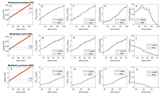 Simulation of experimentally observed relationship between exercise intensity for professional athletes (top row), moderately active individuals (middle row), and individuals with metabolic syndrome (bottom row). (a,f,k) A simulation of exercise, increasing by 35W every ten minutes starting from time t =10 min, with simulations in figures reported from time t = 25 min due to the format of collected data for PA, MA and MtS respectively; (b,g,l) calculated VO2 for PA, MA and MtS respectively; (c,h,m) calculated VCO2 for PA, MA and MtS respectively; (d,i,n) oxidized carbohydrates CHOox for PA, MA and MtS respectively; (e,j,o) oxidized fatty acids FATox for PA, MA and MtS respectively.