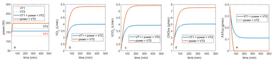 In Figure 3, both of these scenarios are simulated using fits for moderately active individuals as a test case. Effort initiation is simulated as in the previous case, but after Effort reaches a level between either VT1 and VT2 (blue lines), or over VT2 (red lines), it becomes fixed. As can be seen in Figure 3, when Effort is between VT1 and VT2 (Figure 3a), both fats and carbohydrates continue to be oxidized (Figure 3b,c); however, when Effort is above VT2, fat utilization tends to zero, and carbohydrates become the primary nutrient used.