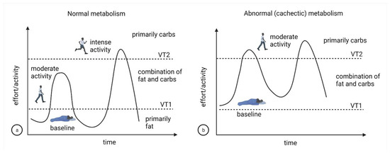 Metabolic patterns such as the second case (over VT2) have indeed been observed in cachectic animals. For instance, Eileen White has recently presented data (7 June 2022, DFCI Cancer and Metabolism 2022 Susan Swerling Lectures), in which autophagy, a normal mechanism of cell degradation that allows orderly recycling of cellular components [26,27], was impaired in mice, which resulted in induction of a cachectic phenotype. Defects in intracellular component recycling resulted in profound alterations of systemic metabolism, showing increased dependency on dedicated nutrient stores causing their depletion, and reduced ability to switch between nutrient sources. The ability to switch between carbohydrate and fat utilization as needed is known as metabolic flexibility [4,28,29]; it has been shown to be significantly impaired in individuals with metabolic syndrome and is likely to be impaired in cancer patients as well.