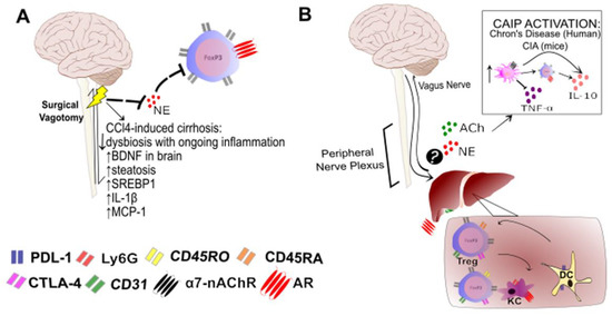 Surgical vagotomy was able to reduce dysbiosis in mice with CCl4-induced cirrhosis, but these animals showed increased levels of brain-derived neurotrophic factor, a key protein involved in the pathogenesis of cirrhosis and associated complications, and inflammatory cytokines such as IL-1β and MCP-1, as well as increased liver steatosis [136]. In keeping with this idea, a model of dextran sulfate sodium-induced colitis showed that vagotomy contributed to disease worsening and increased inflammation, with increasing NF-kB levels and decreasing Treg cell numbers levels [137]. In contrast, Wirth and colleagues demonstrated that lpr-lpr mice, which have autoimmune lymphomyeloproliferative disease, and C57BL/6 mice with 6-OHDA-induced chemical sympathectomy had lower levels of NE and increased levels of Treg cells colocalized in the splenic nerves, suggesting that blocking the neurosympathetic pathway could contribute to disease improvement [138]. These controversial responses may be related to the complexity of and differences in the neural and immune responses in these models.