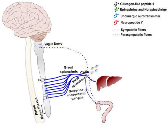 The distribution of sympathetic and parasympathetic nerves in the liver is highly variable among species. In humans, these nerves are observed surrounding the hepatic artery, portal vein, and bile ducts, extending into the hepatic lobules and reaching liver parenchymal cells [111]. Through autonomic nervous system (ANS) fibers, a bidirectional connection is mediated between the liver and the central nervous system (CNS), a characteristic that can affect liver metabolic and immunological responses. The sympathetic splanchnic nerves that innervate the liver originate from neurons in the celiac and superior mesenteric ganglia (Figure 3). The parasympathetic nerves mainly originate from preganglionic neurons in the dorsal motor nucleus of the vagus, which is located in the dorsal brainstem (Figure 3) [112]. Sympathetic and parasympathetic efferent nerves in the liver contain aminergic epinephrine and norepinephrine (NE), in addition to cholinergic neurotransmitters and peptidergic components, such as neuropeptide Y (NPY) (Figure 3) [109].