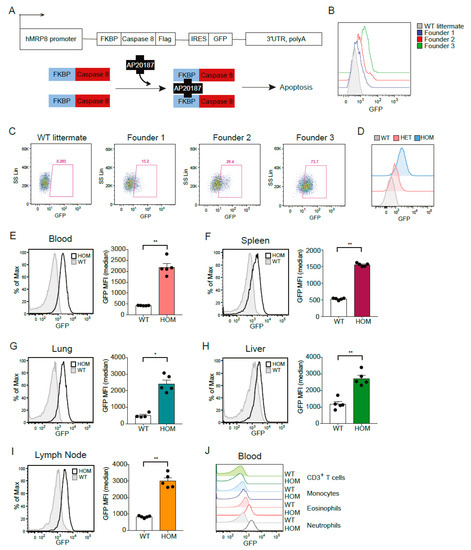 Generation and characterization of hMRP8-ATTAC mice. (A) Schematic representation of the ATTAC construct and the mechanism of apoptosis induced by the dimerizer AP20187. (B,C) Histograms and dot plots showing GFP expression in circulating neutrophils of four heterozygous hMRP8-ATTAC founders, as determined by flow cytometry. One of the founders does not carry the transgene as detected by PCR (WT littermate); the other three carry the transgene and express GFP at different levels (Founders 1, 2, 3). (D) Representative histograms of GFP expression in circulating neutrophils of heterozygous and homozygous hMRP8-ATTAC mice compared to WT littermates, as determined by flow cytometry. (E–I) Representative histograms of GFP expression and quantification of the Median Fluorescence Intensity (MFI) of GFP in neutrophils from blood (E), spleen (F), lung (G), liver (H), and lymph nodes (I) of homozygous hMRP8-ATTAC mice (n = 5) compared to WT littermates (n = 4–5), as determined by flow cytometry. (J) Representative histogram comparing GFP expression levels in circulating neutrophils, eosinophils, monocytes, and CD3+ T cells of homozygous hMRP8-ATTAC mice and WT littermates. WT, wild type; HET, heterozygous; HOM, homozygous. Data presented in E-I are mean values ± SEM. * p < 0.05, ** p < 0.01 by Mann–Whitney test.