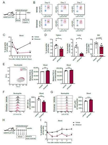 Dimerizer treatment reduces neutrophil frequency in hMRP8-ATTAC mice. (A) Schematic representation of the experimental design. Female homozygous hMRP8-ATTAC mice were treated daily with vehicle or dimerizer for seven consecutive days. Blood was analyzed by flow cytometry before the start of the treatment and two days after the start of the treatment. At the seventh day, mice were sacrificed and tissues were processed and analyzed by flow cytometry. (B) Representative dot plots showing neutrophils (as percentages of live cells) in the blood of either vehicle- or dimerizer-treated hMRP8-ATTAC mice before treatment (day 0) and after two or seven days of treatment. (C) Neutrophil frequencies in the blood of vehicle- or dimerizer-treated hMRP8-ATTAC mice (n = 6/group) over a period of seven days. (D) Frequencies of neutrophils in spleen, lung and bone marrow of hMRP8-ATTAC mice (n = 6/group) treated with vehicle or dimerizer for seven consecutive days. (E–G) Characterization of remaining neutrophils upon seven days of vehicle or dimerizer treatment showing a dot plot and quantification of their granularity (SSC) and size (FSC) (E), and histograms and quantification of the Median Fluorescence Intensity (MFI) of cell surface markers CD11b (F) and Ly6G (G). (H) Experimental design of long-term dimerizer administration. Female homozygous hMRP8-ATTAC mice were daily treated with vehicle or dimerizer for five weeks. Blood was drawn once a week, starting at day 0 before treatment initiation. After five weeks of treatment, mice were sacrificed, and blood and bone marrow were analyzed using flow cytometry. (I) Circulating neutrophil frequencies were determined by flow cytometry during five weeks of vehicle or dimerizer treatment in hMRP8-ATTAC mice (n = 6/group). Data presented in (C–G) and (I) are mean values ± SEM. * p < 0.05, ** p < 0.01, *** p < 0.001, **** p < 0.0001 by unpaired t-test followed by Holm-Sidak’s correction for multiple comparisons (C,I) or * p < 0.05, ** p < 0.01 by Mann–Whitney test (D–G). n.s., not significant; MFI, Median Fluorescence Intensity.
