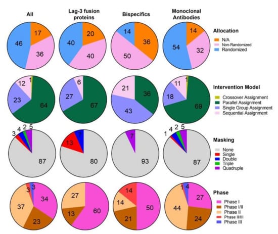 LAG-3-targeted therapy clinical landscape allocation, intervention models and masking of LAG-3 targeted molecules including LAG-3 fusion proteins, bispecific molecules and monoclonal antibodies (https://clinicaltrials.gov/, accessed on 29 June 2022). Percentages are indicated within the graphs.