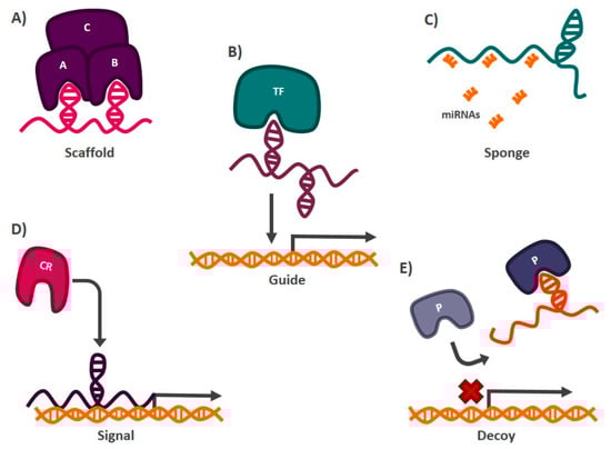 Mechanisms of action of lncRNAs. (A) Scaffolds. They allow the formation of protein complexes. (B) Guides. They direct gene expression regulatory proteins or transcription factors (TFs) to sites in the genome where activation or inactivation of gene expression is demanded. (C) Sponges. They inhibit the activity of miRNAs by interacting directly with them. (D) Signals. They indicate to chromatin remodeling (CR) proteins the region of the genome where gene activation or silencing is required. (E). Decoy. They prevent the interaction of proteins (P) with their target by interacting directly with them.