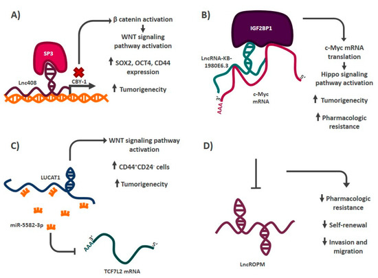 Mechanism of action of some stemness regulatory lncRNAs in breast cancer. (A) Lnc408 acts as a guide by recruiting chromatin remodelers to the promoter region of CBY-1, preventing its expression, and allowing the activation of the WNT signaling pathway. (B) LncRNA-KB-1980E6.3 forms an RNA–protein complex that stabilizes the mRNA of the C-MYC oncogene, allowing its translation, which generates the acquisition of some characteristics that define the stem phenotype. (C) LUCAT1 is a lncRNA that acts as a sponge of miR-5582-3P, promoting the activation of the WNT signaling pathway and thus increasing the proportion of CD44+ CD24− cells. (D) Inhibition of LncROPM decreases some of the characteristics that define the stem phenotype, although its mechanism has not yet been elucidated.