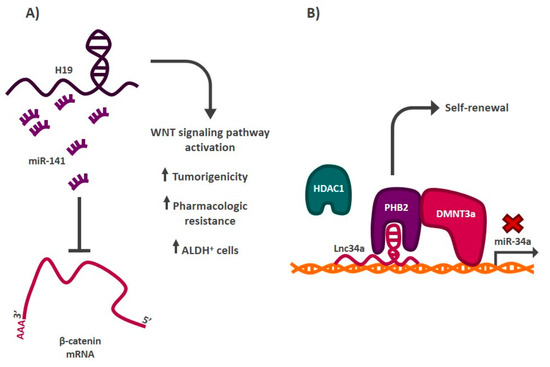 Role of lncRNAs in the regulation of the stem phenotype in colorectal cancer. (A) lncRNA H19 functions as a sponge by sequestering miR-141, a negative regulator of β-catenin mRNA, generating the activation of the WNT signaling pathway and increasing the proportion of ALDH cancer stem cells+, among other features. (B) Lnc34a recruits chromatin remodelers to the promoter region of miRNA-34a, blocking its expression. This allows cancer stem cells to self-renew.