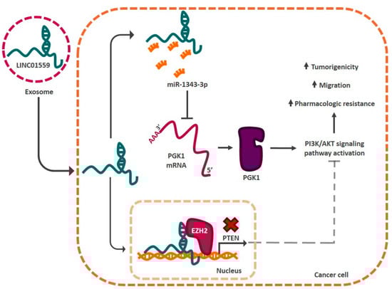 The tumor microenvironment influences the activation of stemness regulatory lncRNAs in gastric cancer. LncRNAs, such as LINC01559, can be secreted by cells in the microenvironment via exosomes. LINC01559 enters cancer cells and activates the PI3K/AKT signaling pathway. There, it acts as a sponge for miR-1343-3p, allowing the translation of PGK1 kinase mRNA and activating the signaling pathway. In addition, this lncRNA acts as a signal to recruit chromatin remodeling complexes to the PTEN promoter region, preventing its expression. This allows the signaling system to be activated and the cancer cells to acquire capacities associated with the stem phenotype.